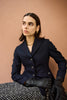 スーパー140's 2/72。梳毛二重織りでソフトな手触りの上質なウール。程よい艶感があり高級感漂う上品な素材を使用。ボディーシルエットが綺麗に見えるジャケットです。フロントのビジューボタンがポイント。